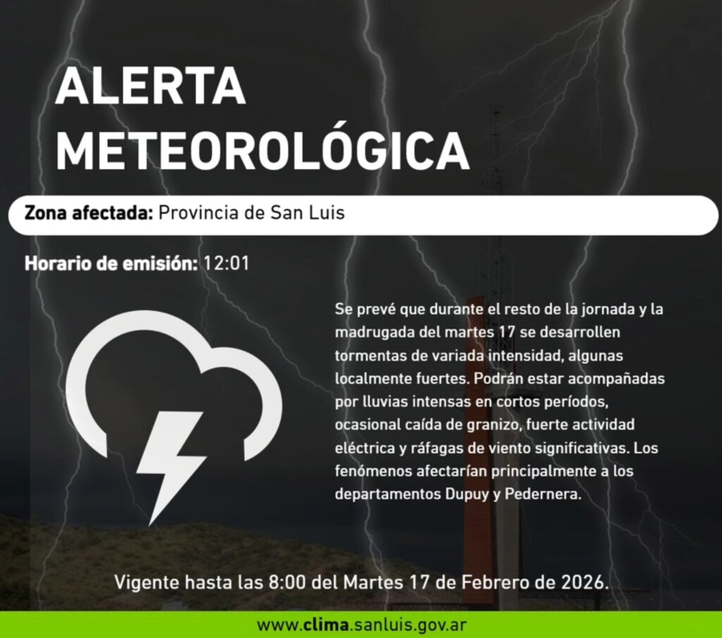 Los fenómenos afectarían principalmente a los departamentos Dupuy y Pedernera.