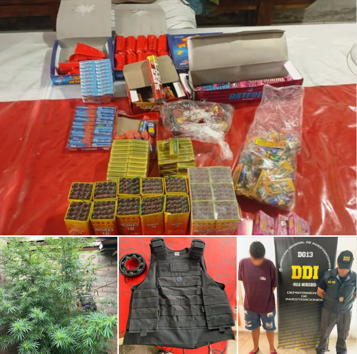 Los operativos se llevaron a cabo en tres domicilios ubicados en Leonismo Argentino y Ramón Valdez, Lisandro de la Torre al 500 y Dr. Domínguez al 1000. Durante los procedimientos se secuestraron distintos elementos de interés para la causa, entre ellos una réplica de pistola tipo 9 milímetros, cartuchos de escopeta calibre 16, una garrafa de aire comprimido, placas metálicas de fabricación casera, un chaleco de transporte y una importante cantidad de pirotecnia. Además, en uno de los domicilios se hallaron tres plantas de cannabis de gran tamaño.