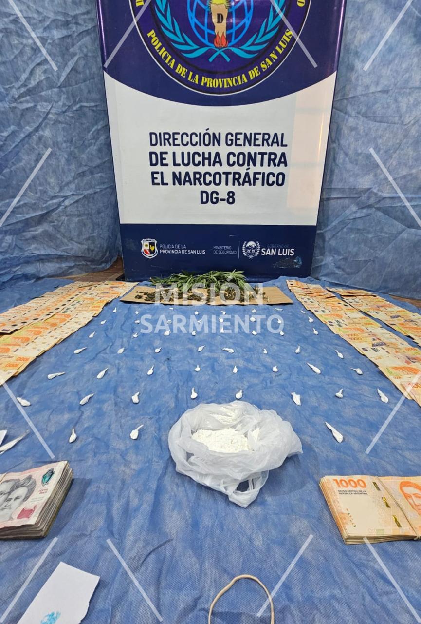 Los allanamientos fueron ordenados por el Juzgado Federal de Villa Mercedes, y uno de ellos se realizó en un domicilio de calle Chile al 600, en el barrio Libertad, donde la Policía incautó y secuestró florescencias y ramilletes de marihuana; 53 envoltorios de nylon con cocaína; varios recortes de nylon; un teléfono celular; $523.650 en efectivo; dos plantas de marihuana y una motocicleta Kawasaki vinculada a la investigación.