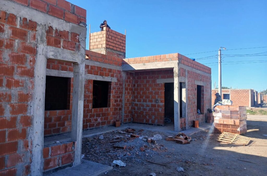 En términos generales, ya se completaron las 42 fundaciones y actualmente se progresa con el levantamiento de mampostería en todo el predio. Los mayores avances se observan en las viviendas que ya cuentan con losas ejecutadas, donde además se incorporaron instalaciones eléctricas —con cajas, cañerías, ventilaciones y pases para señales débiles— y comenzaron las cañerías de agua. En paralelo, otros sectores presentan distintos niveles de ejecución, con unidades en etapa de mampostería, viviendas listas para iniciar losas y casos puntuales, como las viviendas adaptadas, que avanzan según su planificación específica.
