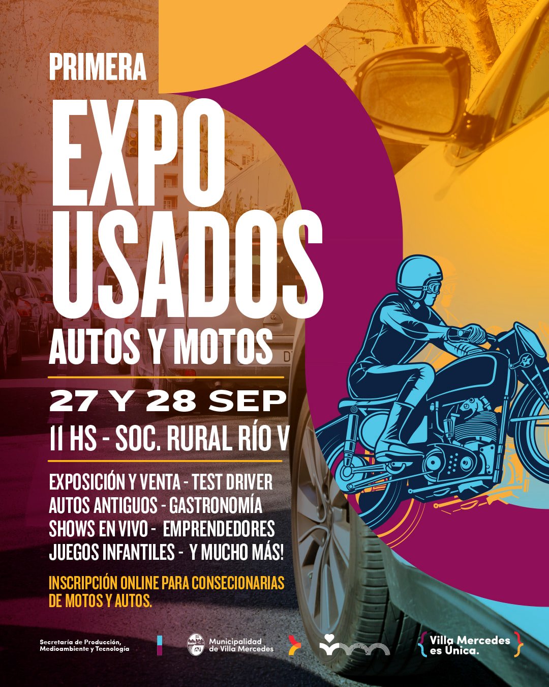 Este 27 y 28 de septiembre desde las 11 hs. te esperamos en la Sociedad Rural Río V para vivir dos jornadas de exposición y venta de autos y motos.