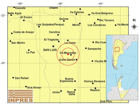 Según el Instituto Nacional de Prevención Sísmica (Inpres) fue de magnitud 2,6. y una profundidad de 9 km. 14 km al NO de Mercedes.