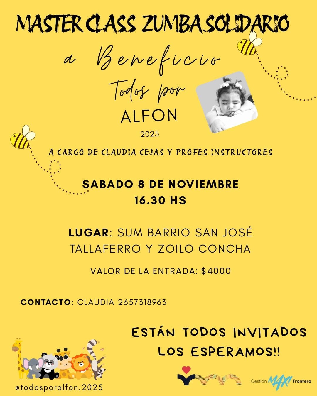 Este sábado 8 de noviembreen el SUM del barrio San José (Tallaferro y Zoilo Concha) se realizará una Master Class de Zumba Solidario a beneficio de Alfonsina.